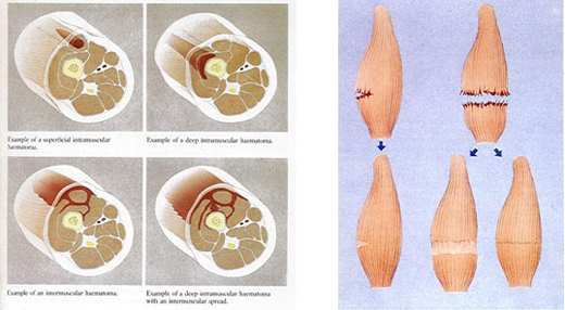 Kaslarda direkt travma (darbe) veya indirekt travma (fazla yüklenme) sonucu hasar görülebilmektedir. Sonuçta kasta kanama (hematom) veya yırtık (rüptür) oluşmaktadır. Kas yırtılmaları tam (total) veya kısmi (parsiyel) olarak görülür. Gerilme (çekme) veya kompresyon (sıkıştırma) sonucu oluşurlar.