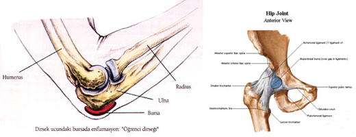 Bursalar; kemik-tendon, tendon-tendon ve cilt-kemik arasında bulunan, sürtünmeyi azaltma ve yük stresini dağıtma görevleri olan içi sıvı dolu keseciklerdir. Bursalarla ilgili problemleri direkt ya da indirekt travmalar sonucu görülen hemobursa ve inflamatuvar reaksiyonlar sonucu oluşan bursitler olarak iki şekilde inceleyebiliriz. Bursitler; friksiyonel bursit, septik bursit ve kimyasal bursit olarak üçe ayrılmaktadır. Aşırı kullanım tipi yaralanmalar içinde friksiyonel bursitler incelenebilir.